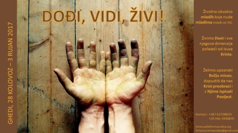 To što vam želimo predložiti jest mogućnost da djelimo zajedno Život, u jednostavnosti svakodnevnice zajedno s mladima i drugim članovima Fondacije Utvrda Bezgrešne. Iskusit ćemo trenutke u radu, molitvi i zajedništvu sjedinjeni s Isusom Kristom kako bi ga upoznavali, ljubili i biti sretni!!!