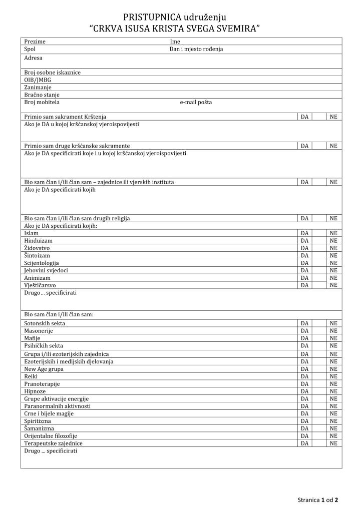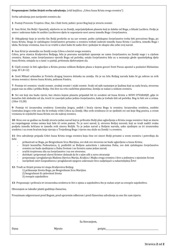 Postoji također i jedno konkretnije pripadanje Crkvi Isusa Krista Svega Svemira preko živog prikazanjaza ovu Crkvu, preko jedne posvete u nekoj službi u ovoj Crkvi. Postoje različiti načini sudjelovanja i različiti načini posvećenja; jedan od njih bi mogao biti i taj da konkretno budeš član Udruženja Crkve Isusa Krista Svega Svemira, o čemu smo već govorili. Na web stranici ćete moćipronaći obrazac za prijavu i tako ćetemoći reći: “Ja sam tu”. To je već jedannačin svjedočenja: “Ja sam dio Crkve, želim biti u Crkvi Isusa Krista”.